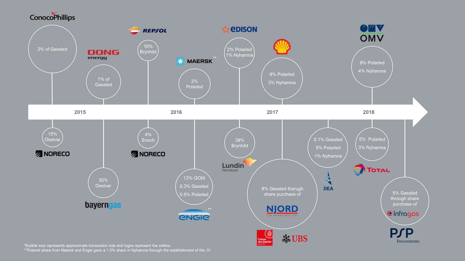 Over the four years from the first acquisition was made in 2015, a total of 16 transactions were concluded: Five late-life E&P asset acquisitions, Nine gas infrastructure asset acquisitions, and two major corporate acquisitions. This coincided with the downturn in the oil and gas industry, where solid and knowledgeable buyers were able to take advantage of the fact that many established companies were looking to realign their asset portfolios.